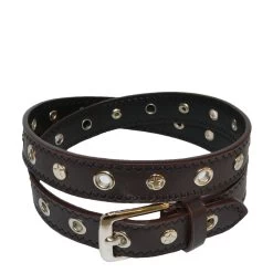This Girls belts are a hot pink and a brown PVC belt with studded stars and polished silver eyelets. The back of the belt is black and the end is tapered with a polished silver buckle.
