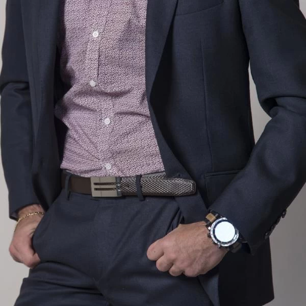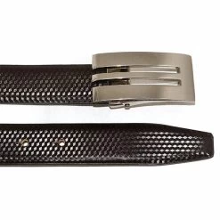 Coordinating leather colour within an outfit is a sign of considered dressing. A honeycomb like pattern is on one side & matte chocolate dark brown finish on the other. A uniquely designed high shine silver buckle completes this sharp reversible style.