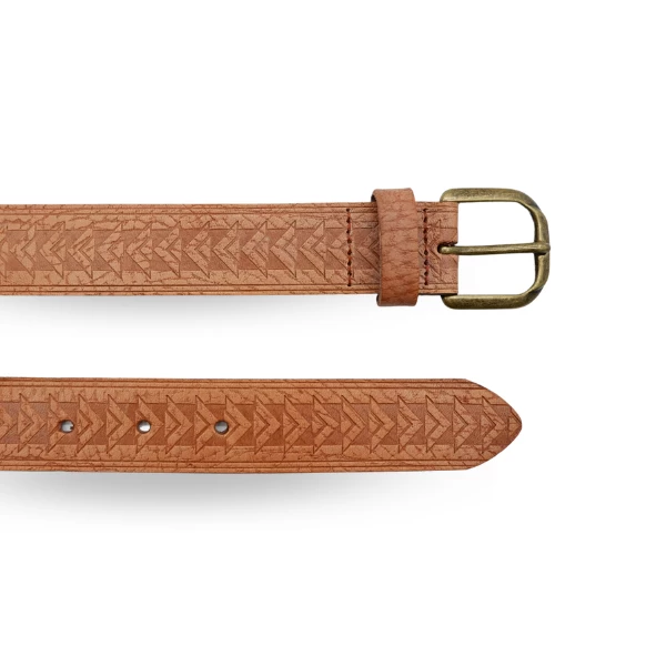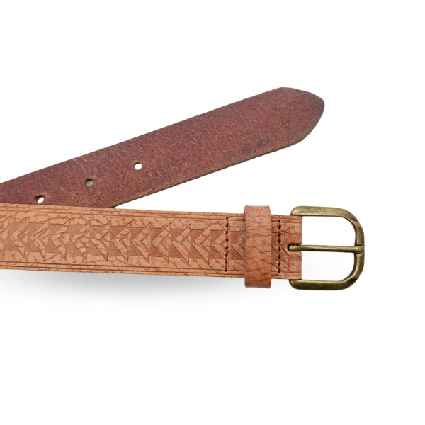 Classic Roman style embossed genuine leather brown tan belt. It features an antique brass buckle. Strap is 30mm wide.