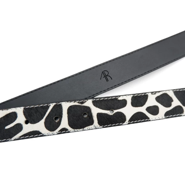 Trendy women’s leather belt by Addison Road featuring trendy cow print faux pony hair on a genuine leather strap. This belt has a sleek shiny gold buckle.Â