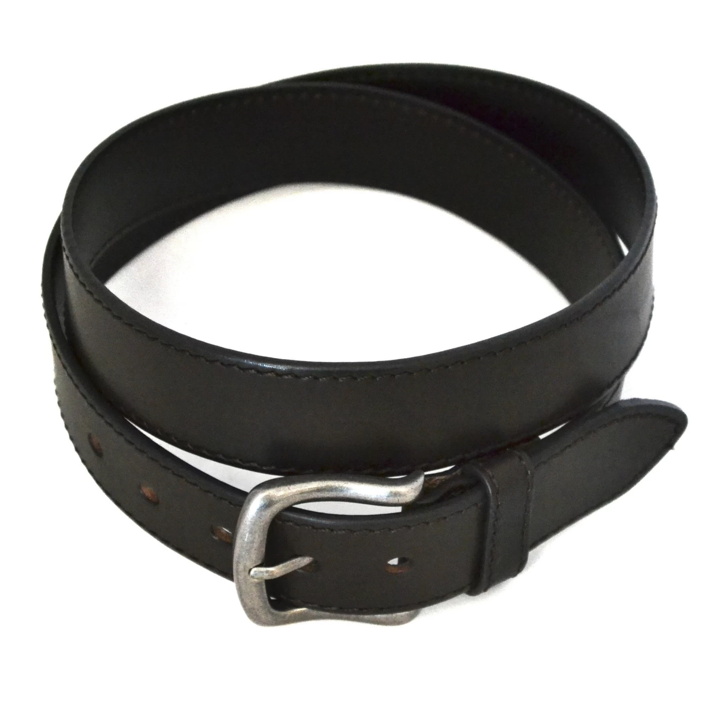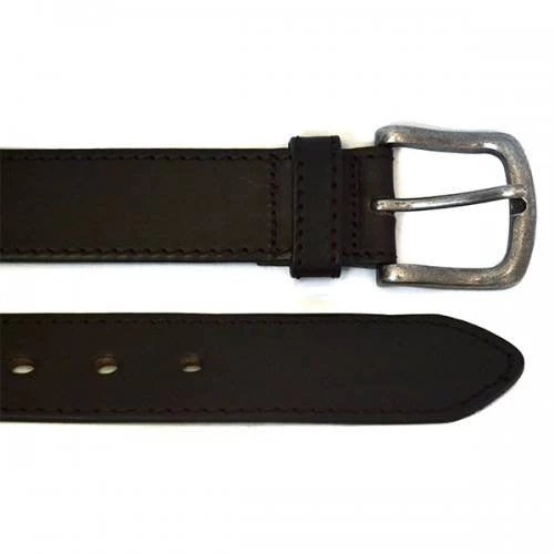 Stylish thick genuine leather dark brown belt with full stitch to both edges, matching brown loop and tapered end. Featuring an antique brushed silver buckle. Strap is 35mm wide.