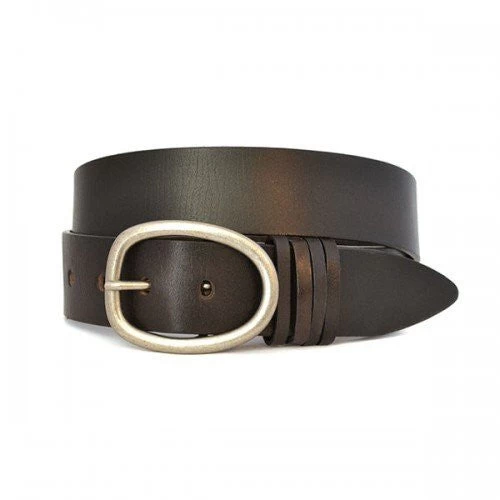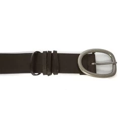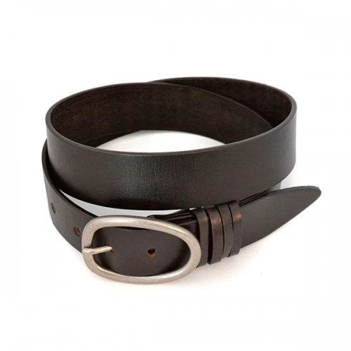 Fashionably styled soft genuine leather dress belt in textured black or dark brown, with the strap having a tapered end. Featuring a antique finish buckle. Strap is 28mm wide.