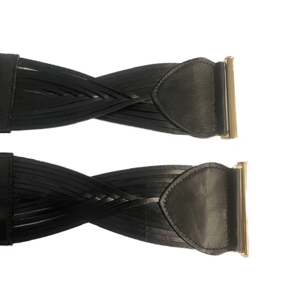 Elizabeth is a modern, genuine leather plaited belt with golden hardware. This belt features an elastic back that will stretch up to 9 inches or 22 cm.Â