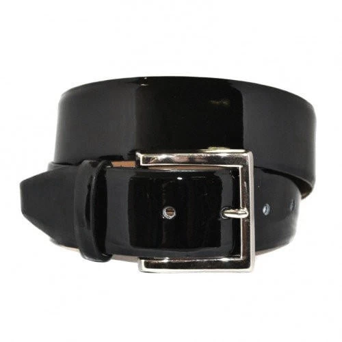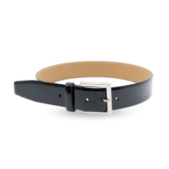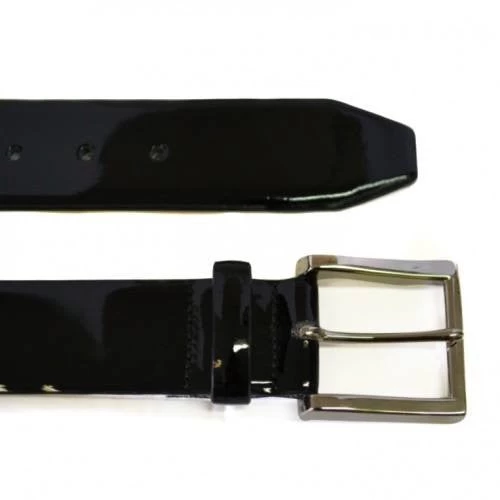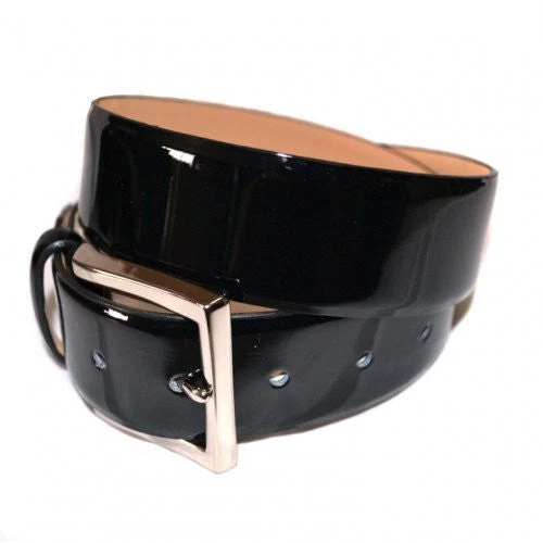 Genuine leather patent belt in black. With a wide silver buckle, this belt is a wardrobe staple.