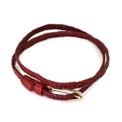 Unique herringbone plait genuine leather belt in red. Sensational as a pant or waist belt. The soft gold, oval shaped buckle adds further interest to this delicate style. Width of belt is 15mm. Ideal for vintage-inspired styling with dresses or skirts. Can also pair up with jeans and T-shirts for more active styles.Â