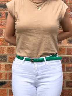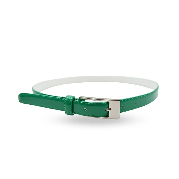 Stylish genuine leather skinny belt. A day to night versatile patent emerald green with matching stitched edge detail. Featuring a polished silver buckle.Β