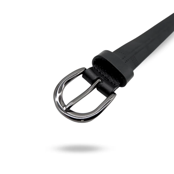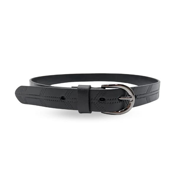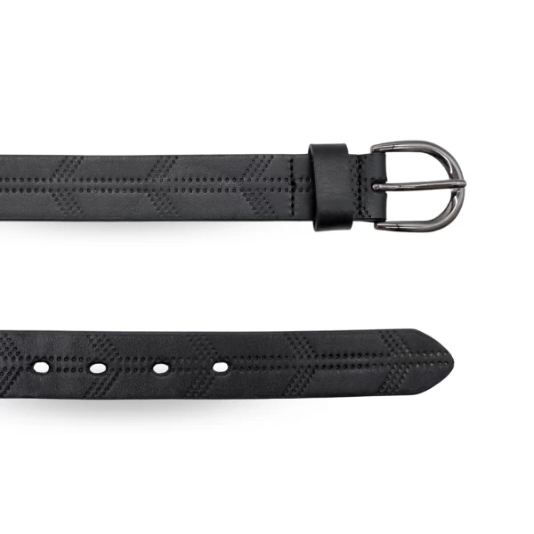 Classic black belt in quality genuine leather. Embossed patterning is featured on this belt, with a polished gunmetal grey buckle. The strap is 28mm wide.