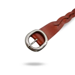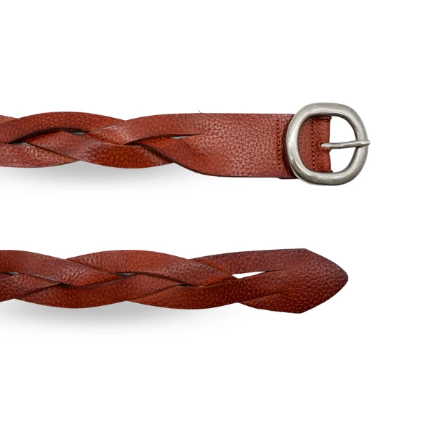 Rustic women’s thick tan/dark brown plait leather belt with antique silver buckle and tapered end. The strap is 40mm wide.