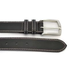 Fashionable premium genuine leather belt in chocolate brown, with contrasting cream stitching. Featuring lightly brushed silver buckle. Strap is 34mm wide.