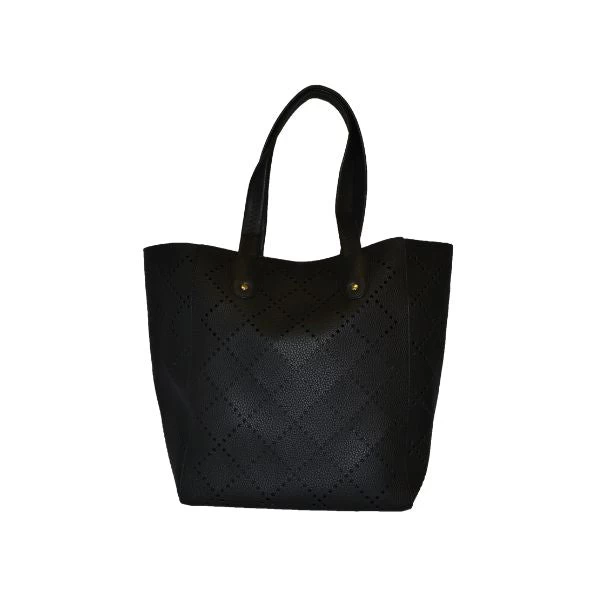 Trendy faux leather tote bag with laser cut pattern detailing throughout. Has a generous main compartment with internal zip pocket and snap button closure at neck.Â