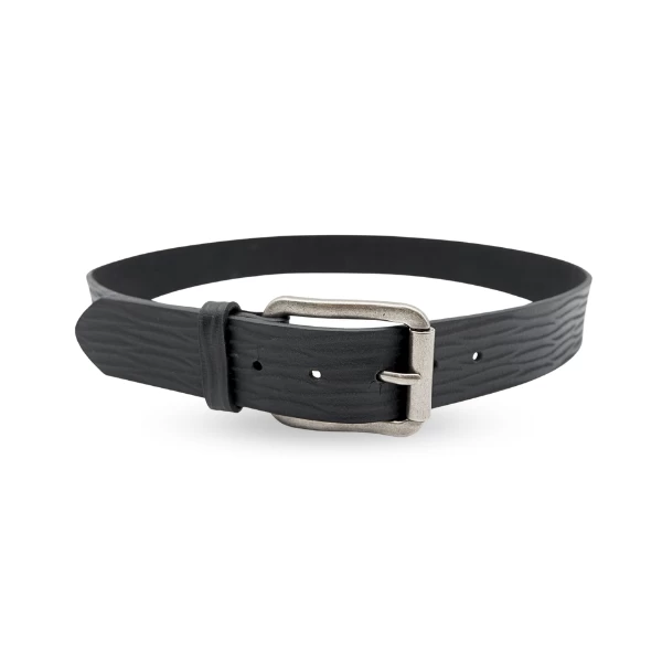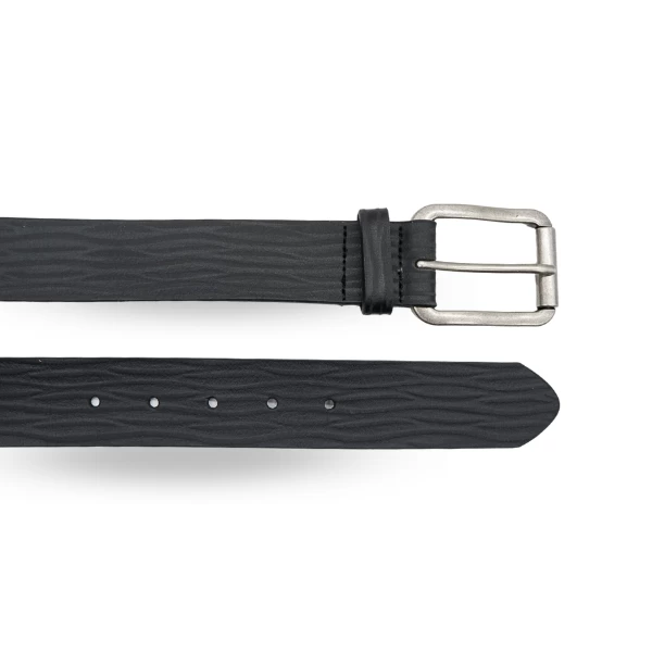 Fashionable premium genuine leather dress belt in black for men with ripple look detail. Featuring an antique silver buckle. Strap is 36mm wide.