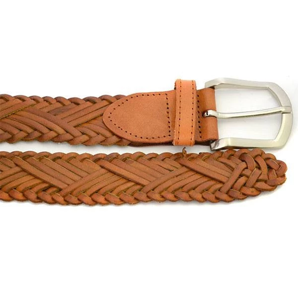Stunning designer premium genuine leather plait detail belt in a golden tan tone. It features a unqiue weave design with a polished silver buckle on a 35mm wide strap