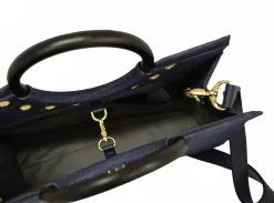 This perfectly sized denim ring handle bag is the trendsetter bomb! We call it the bag with a scarf… Yes, it comes with a complimentary scarf to complete your look. Each bag will have a different style of scarf.