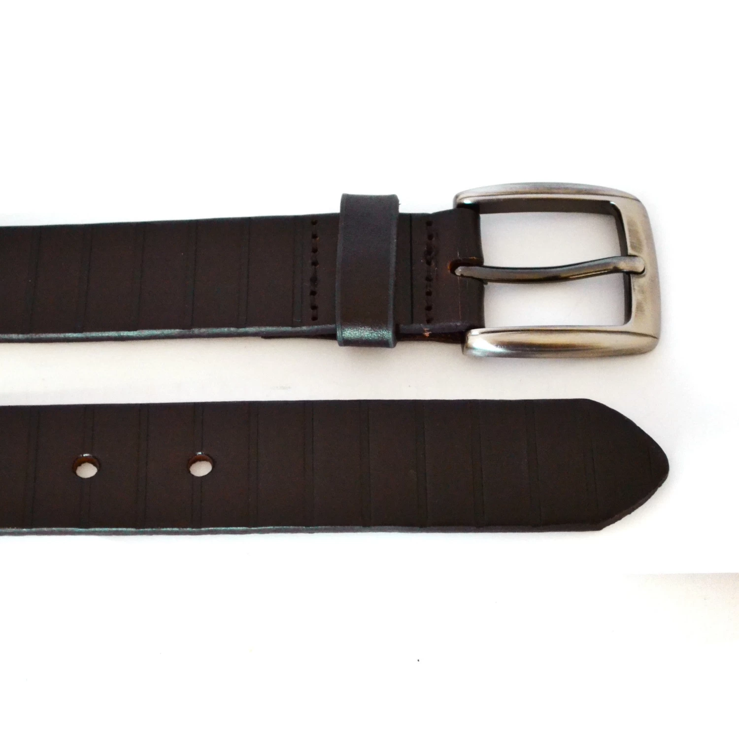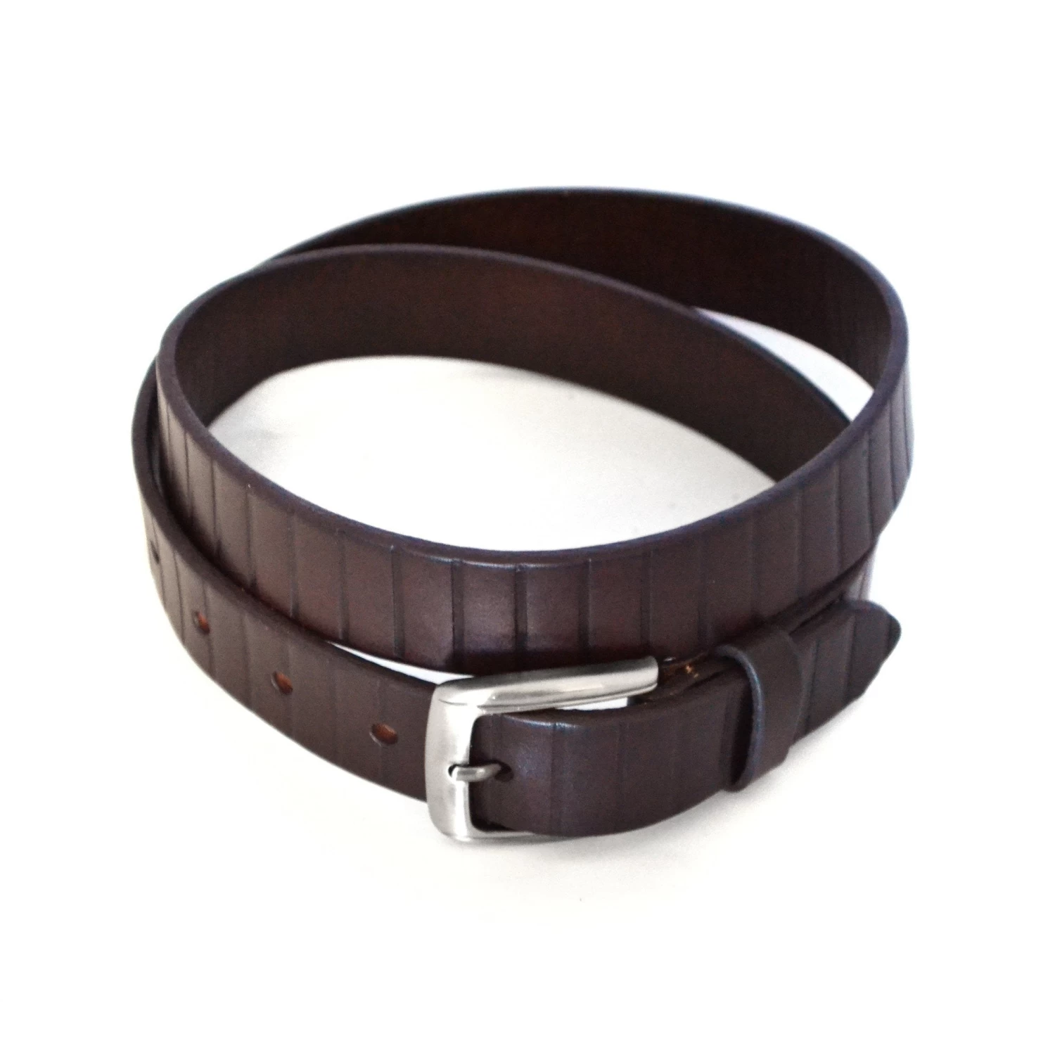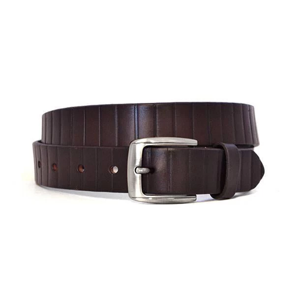 Fashionably styled genuine leather casual dress belt in chocolate brown, with an embossed stripe detail. The strap has a tapered end. It features a semi-brushed silver buckle with an antique patina finish. The strap is 28mm wide.