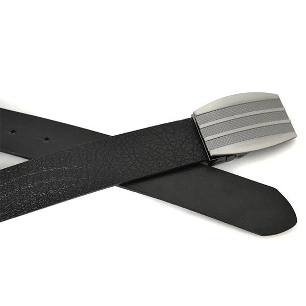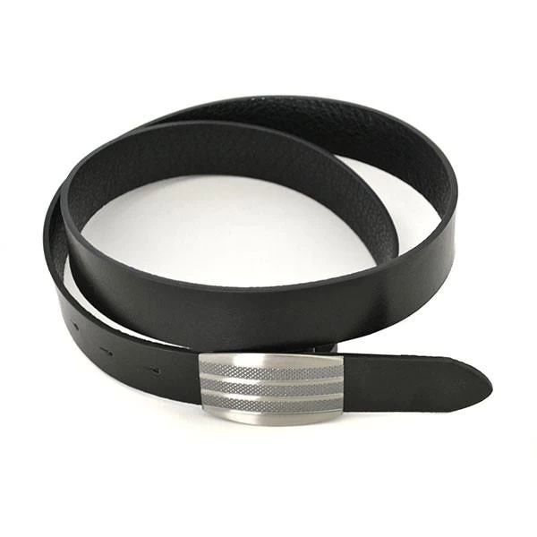 Fashionable reversible genuine leather dress belt, both sides are black, one with a high grain natural matt finish, the other a semi gloss finish. The strap has a tapered end. Featuring a brushed silver & cast pattern detail buckle. The buckle has an added swivel action which brings diverstiy to a simple style. The strap is 30mm wide.