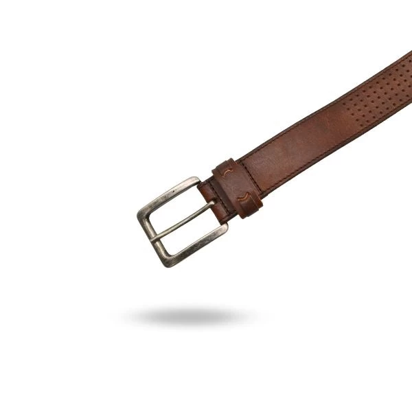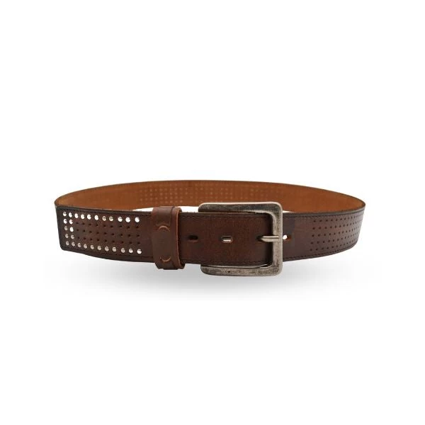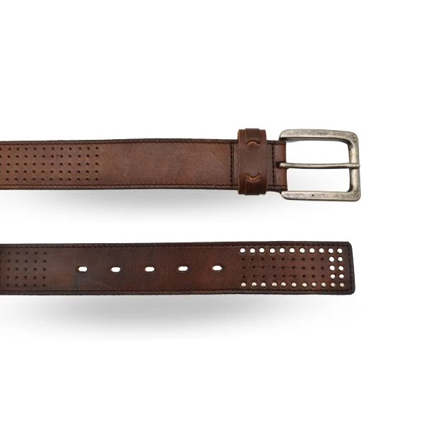 Stylish genuine leather chocolate brown tan belt with punch out detail. Featuring an antique silver buckle. Strap is 38mm wide.