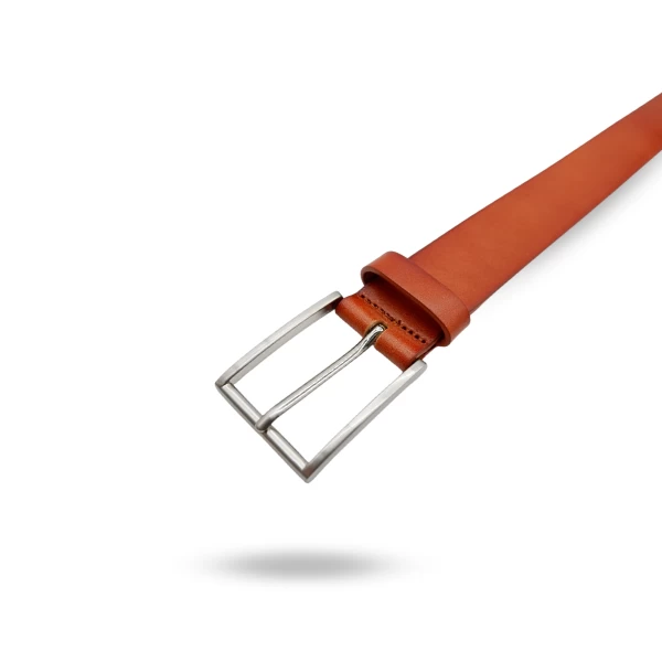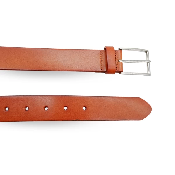 Genuine leather hard wearing, dark tan belt. Featuring sateen finish silver buckle, the strap has a tapered end. Strap is 32mm wide.