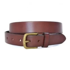 Genuine leather hard wearing dark tan belt. Featuring an antique finished brass buckle. Strap is 28mm wide. Classic design suitable for all genders.Â
