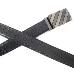 Uniquely designed premium genuine leather belt in black with checked detail. The belt has a stitched feather edge and a tapered end. It features a brushed silver and polished gunmetal grey buckle. The buckle has an adjustable lever along the side for easy size adjustment. Strap is 35mm wide.