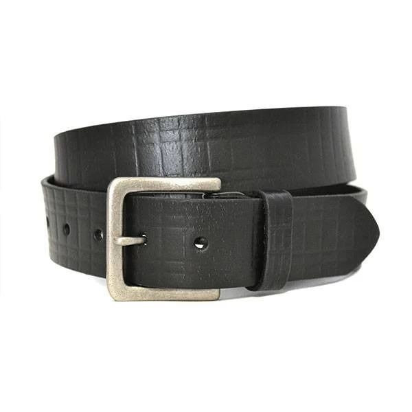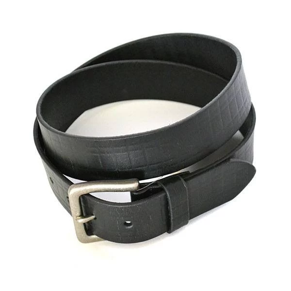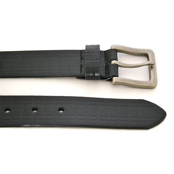 Stylish genuine leather belt, in black with an embossed detail and antique look silver buckle. Strap is 36mm wide.